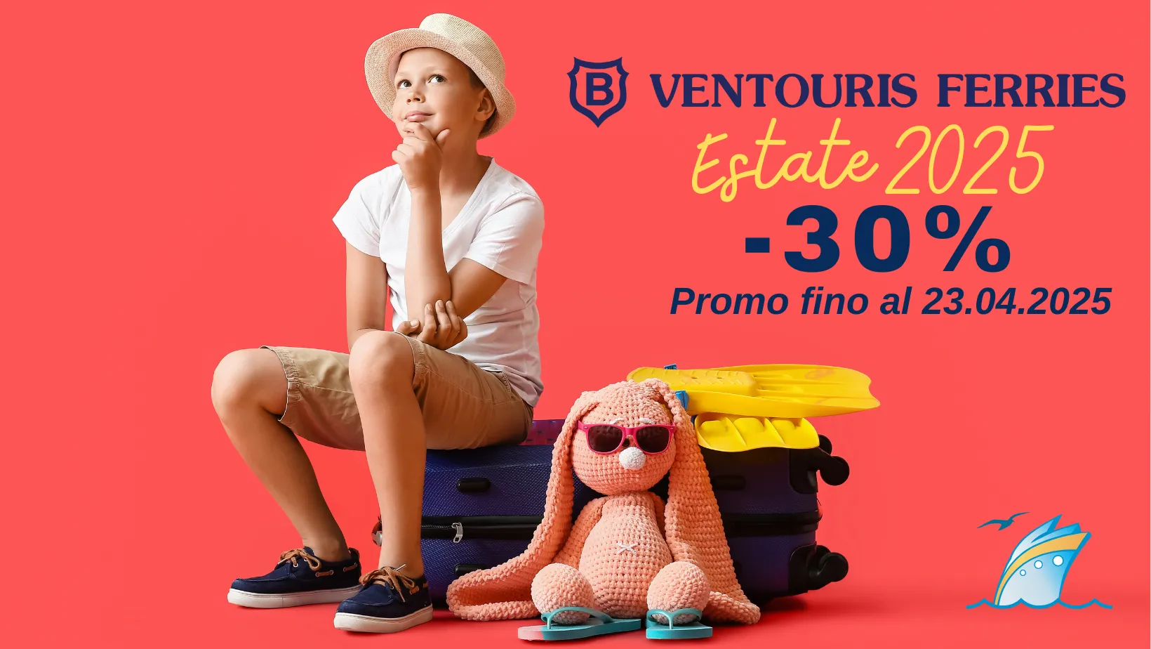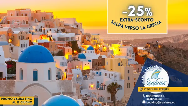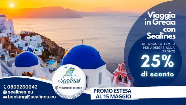 Prenota la tua vacanza estiva a prezzi scontati! Scegli la tratta del tuo viaggio in traghetto per la Grecia, consulta orari, tariffe e promozioni in corso, verifica la disponibilità e acquista il tuo biglietto direttamente dal nostro Portale Traghetti. Se hai bisogno di informazioni, non esitare a contattarci! Il nostro Centro Prenotazioni Traghetti Grecia è continuamente aggiornato sulle novità e sulle offerte della Compagnia VENTOURIS FERRIES. Invia una mail a booking@sealines.eu oppure chiama il numero 0809260042. Puoi ottenere informazioni su offerte e novità anche seguendo i nostri canali social e tramite whatsapp, viber o telegram. Basta aggiungere alla tua rubrica il numero 3441743399 (attivo dal lunedi al venerdi dalle 9:00 alle 19:00 e sabato dalle 09:00 alle 13:00). Il nostro staff sarà lieto di poterti aiutare.