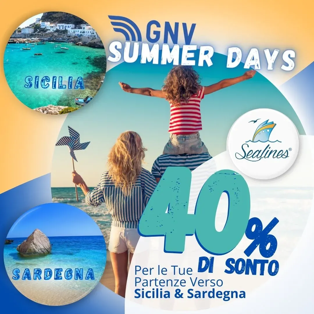 Acquista online il tuo biglietto con la Compagnia Grandi Navi Veloci per la Sardegna o la Sicilia quest’estate e risparmi fino a 40% del prezzo intero del biglietto. Parti con il piede giusto, verifica dal nostro motore di ricerca traghetti le partenze scontate GNV e blocca il miglior prezzo in anticipo.