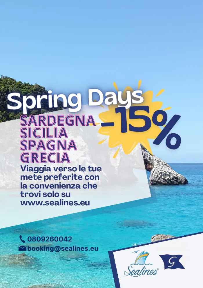 Promo Spring Days fino al 09/06/2024 – l’offerta prevede uno sconto speciale del 15% – diritti fissi e servizi di bordo esclusi – sulla biglietteria dei Traghetti Grecia, Sardegna, Sicilia e Spagna. Si applica alle seguenti sistemazioni: – passaggio nave – supplemento sistemazioni – veicoli – animali domestici L’offerta viene applicata in automatico dal Portale Traghetti Sealines su tutti i biglietti emessi dal 22/05/2024 al 09/06/2022 e valida per le partenze dal 22/05/2024 al 17/12/2024 per le seguenti tratte:
